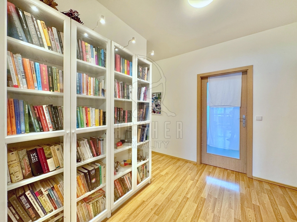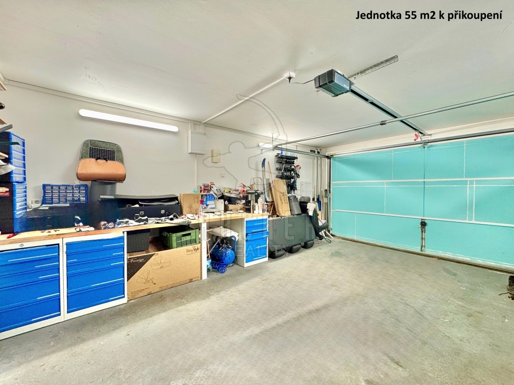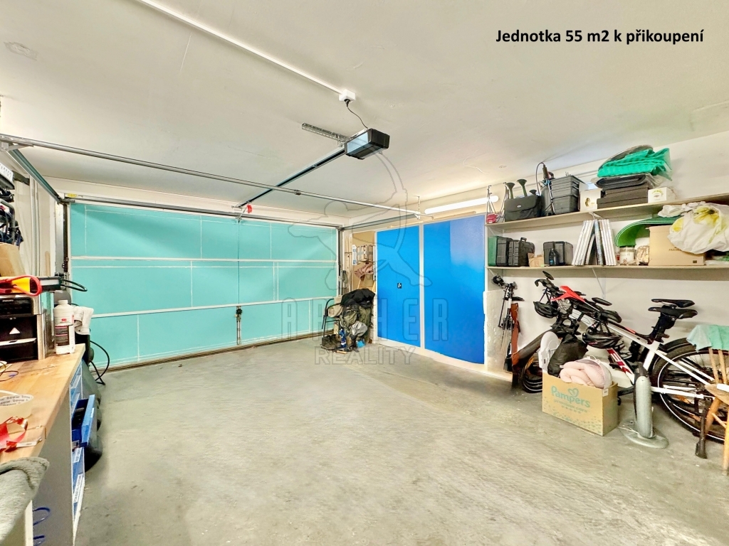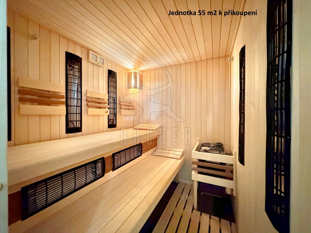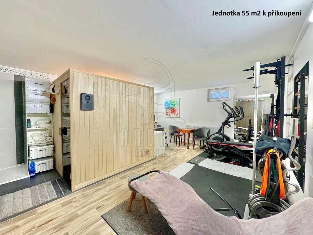 K bytu je možno přikoupit nebytovou jednotku 55m2 a její součástí je dvougaráž. V zadní části je wellness prostor se saunou, posilovnou a sprchou a pracovna.