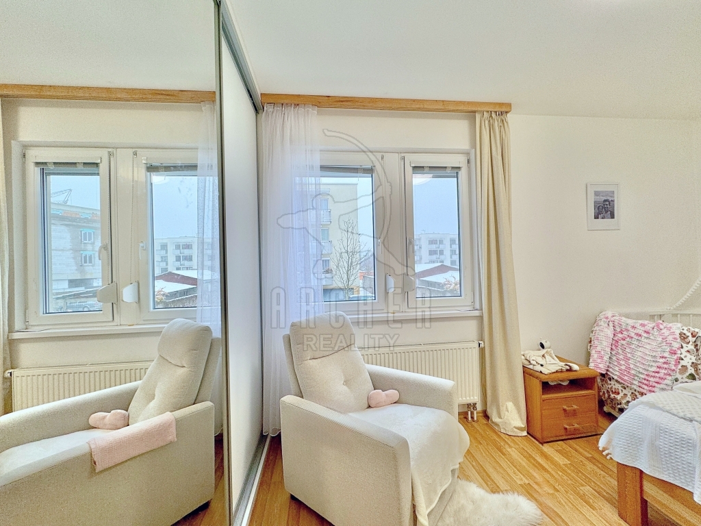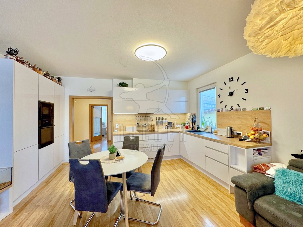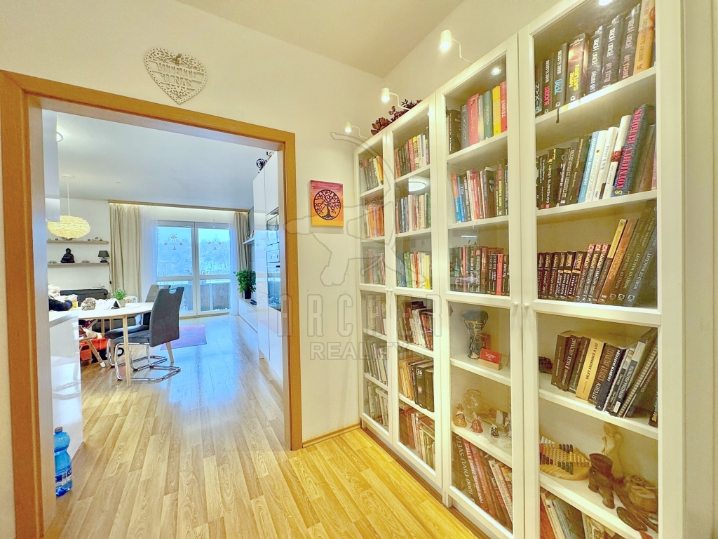 | Popis vybavení bytu | Designová kuchyňská linka z roku 2022 s vestavnými spotřebiči ve vysoké kvalitě a s velmi tichým provozem: indukční varná deska, horkovzdušná trouba, mikrovlnka, myčka, lednice, mrazák. Velké vestavěné skříně se zrcadlovými posuvnými dveřmi, knihovna s osvětlením a prosklenými dvířky. |