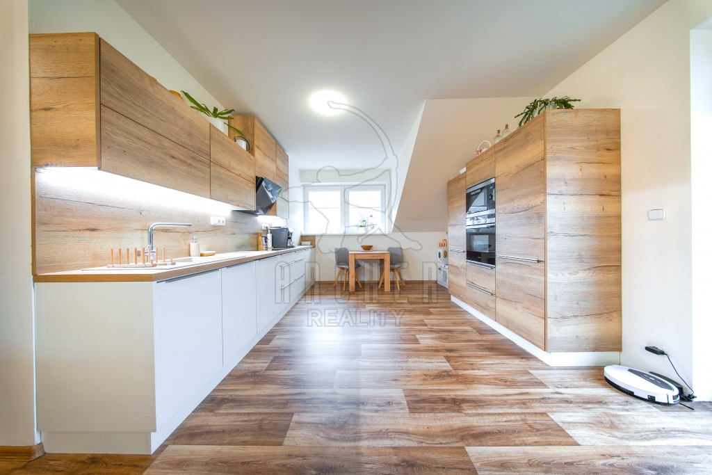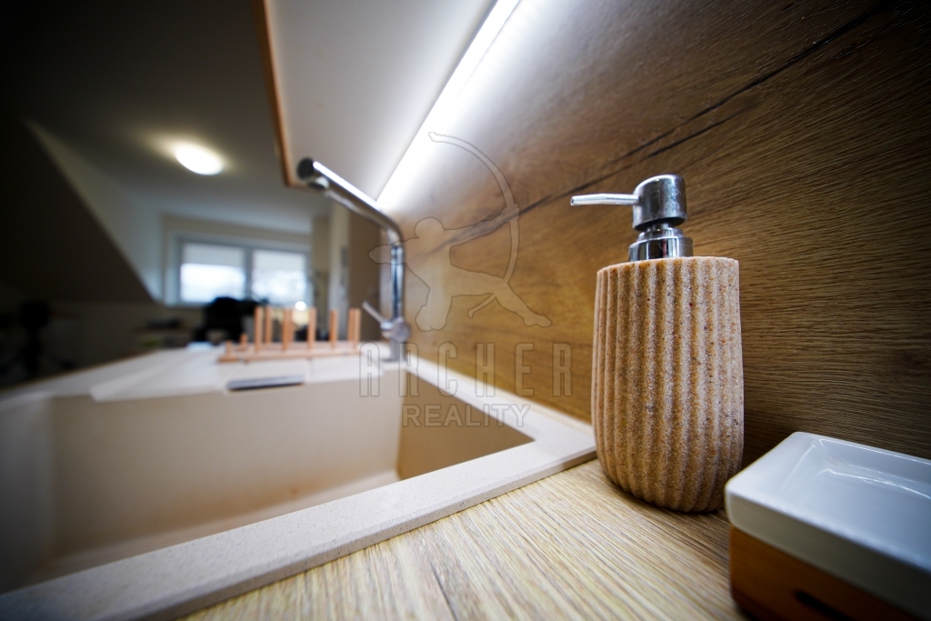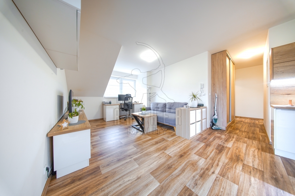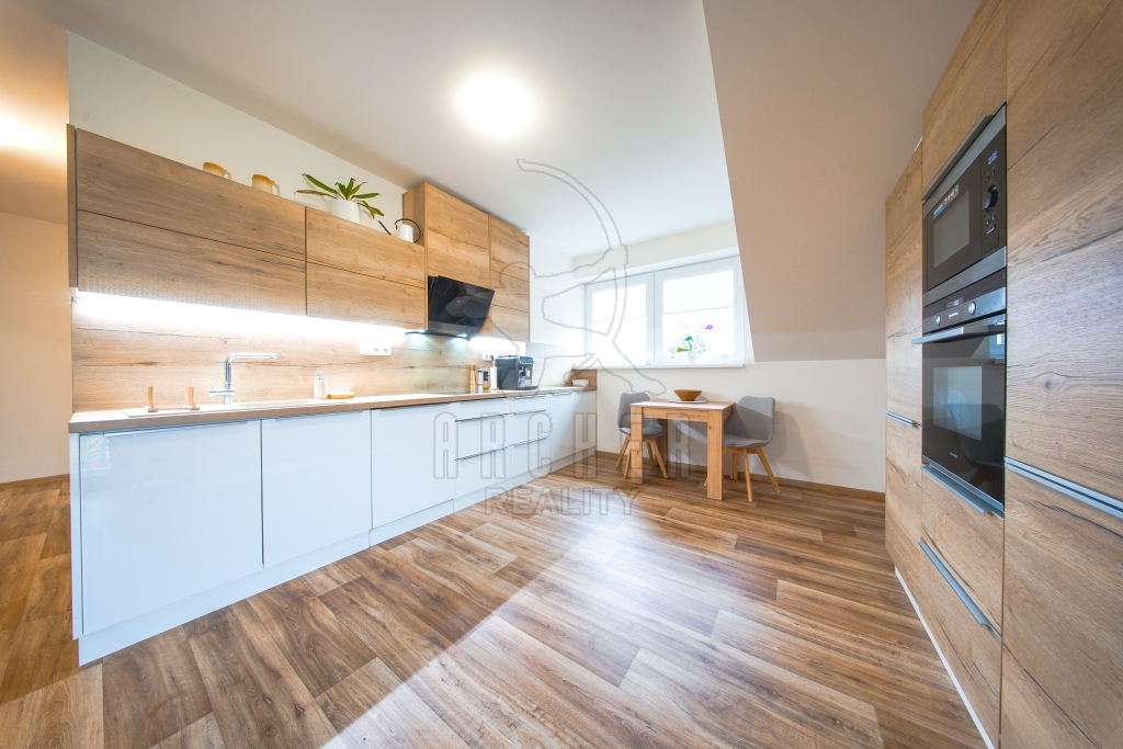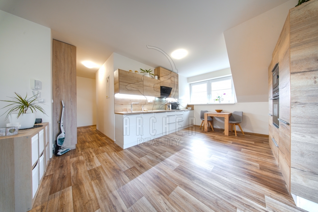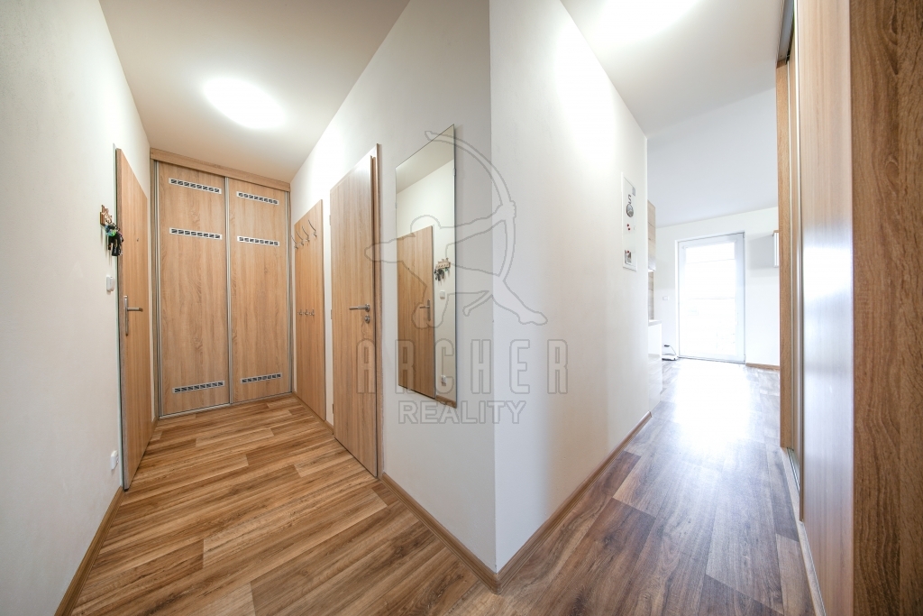 Útulný a světlý byt z jehož 4,3m2 balkonu máte výhled do přírody, se může stát vašim novým domovem. Hlavním obytným prostorem je obývací pokoj, s velkým kuchyňským koutem, ve kterém je velmi prostorná linka vybavená myčkou nádobí a varnou deskou. Proti ní je úložný prostor, ve kterém se nachází elektrická a mikrovlnná trouba a také vestavěná lednice a mrazák a potravinová skříň. Balkon je přístupný dveřmi mezi obývací a kuchyňskou částí.