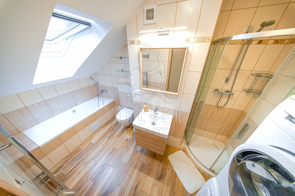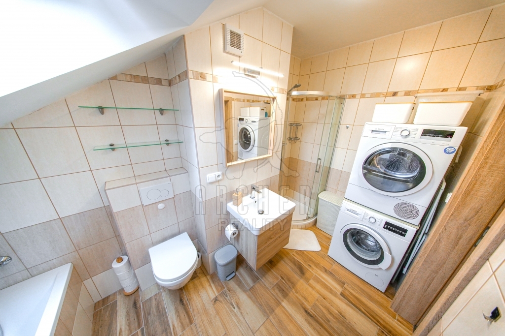 Koupelna s WC je vybavena nejen vanou, ale i sprchovým koutem a jsou zde pračka i sušička. Byt je nabízen vybavený nábytkem tak, jak jej vidíte na fotografiích.
