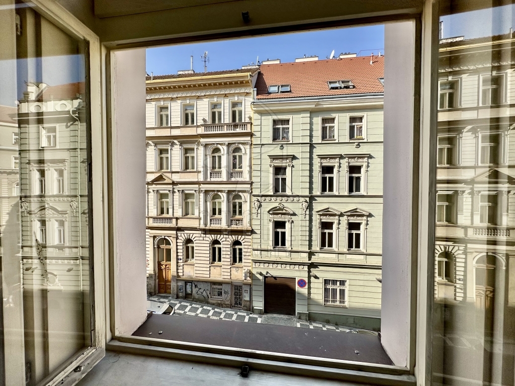 Interiér působí vzdušně díky vysokým stropům a velkým oknům. Velkorysá předsíň s úložnými prostory plynule navazuje na hlavní obytný prostor s kuchyňským koutem. Atmosféru podtrhují dvoukřídlé dveře do ložnice a výhled na zdobné fasády okolních domů. Chytrým využitím výšky místností je vestavěné patro se šatnou, které přidává další úložný i praktický prostor.