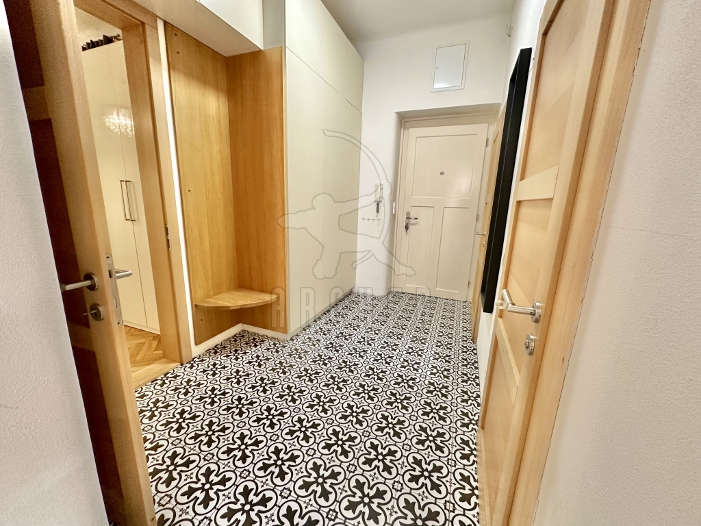 Předsíň s detailně vestavěným nábytkem propojuje celý byt. Vpravo ložnice, vlevo koupelna a samostatná toaleta a přímo hlavní obývací část. Fascinující je kombinace dubových parket a vzorované dlažby.