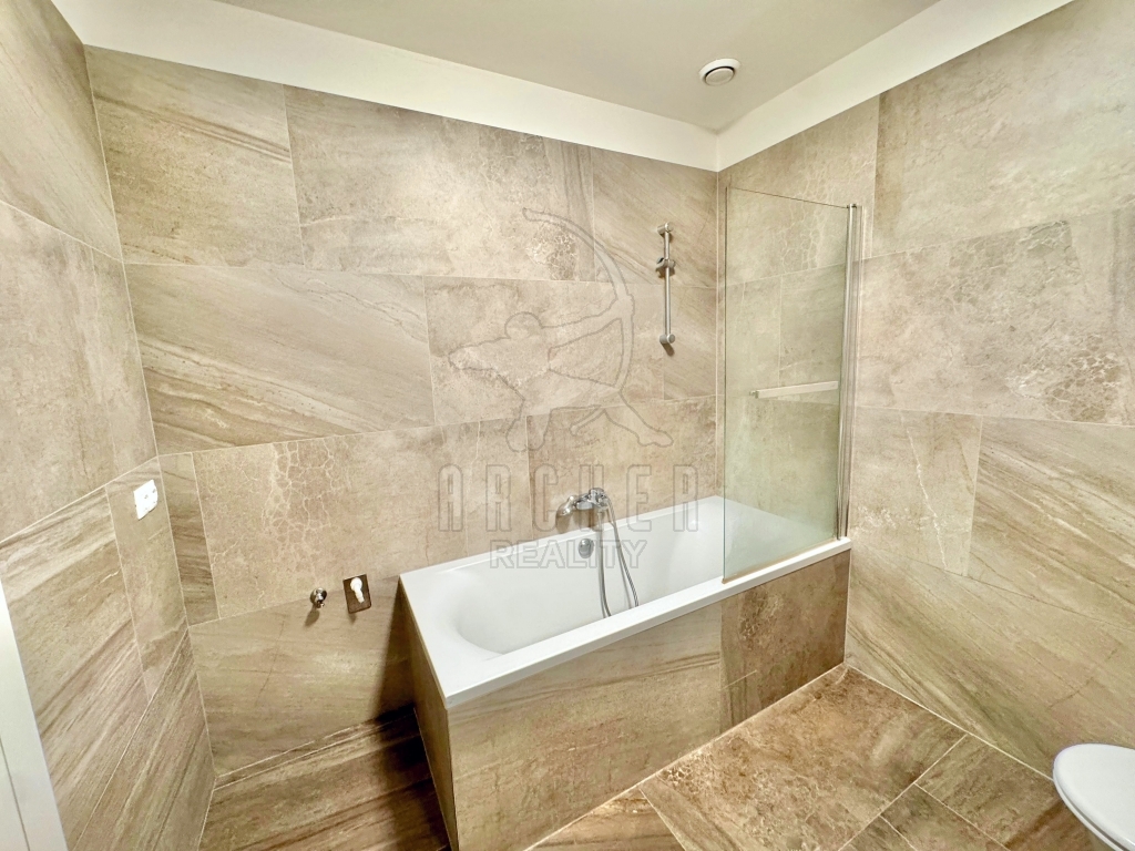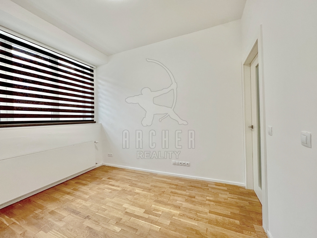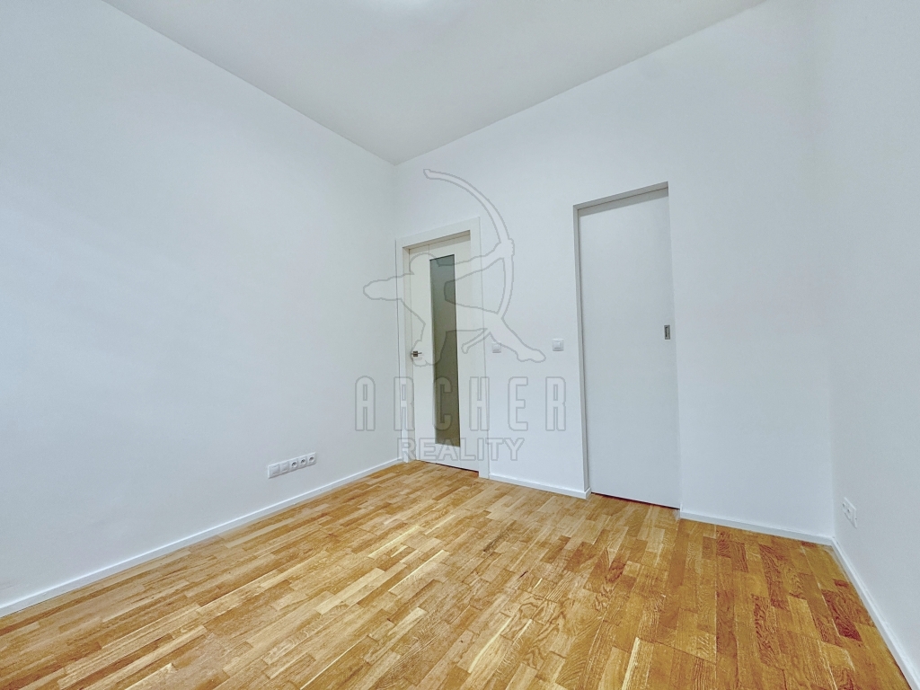 Dveře bytu jsou moderní bezfalcové s designovými klikami. Podlahy mají povrch z masivního dubu. V koupelně jsou velkoformátové dlaždice z umělého mramoru.