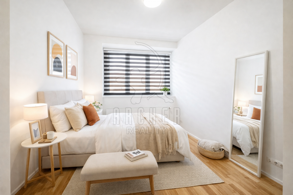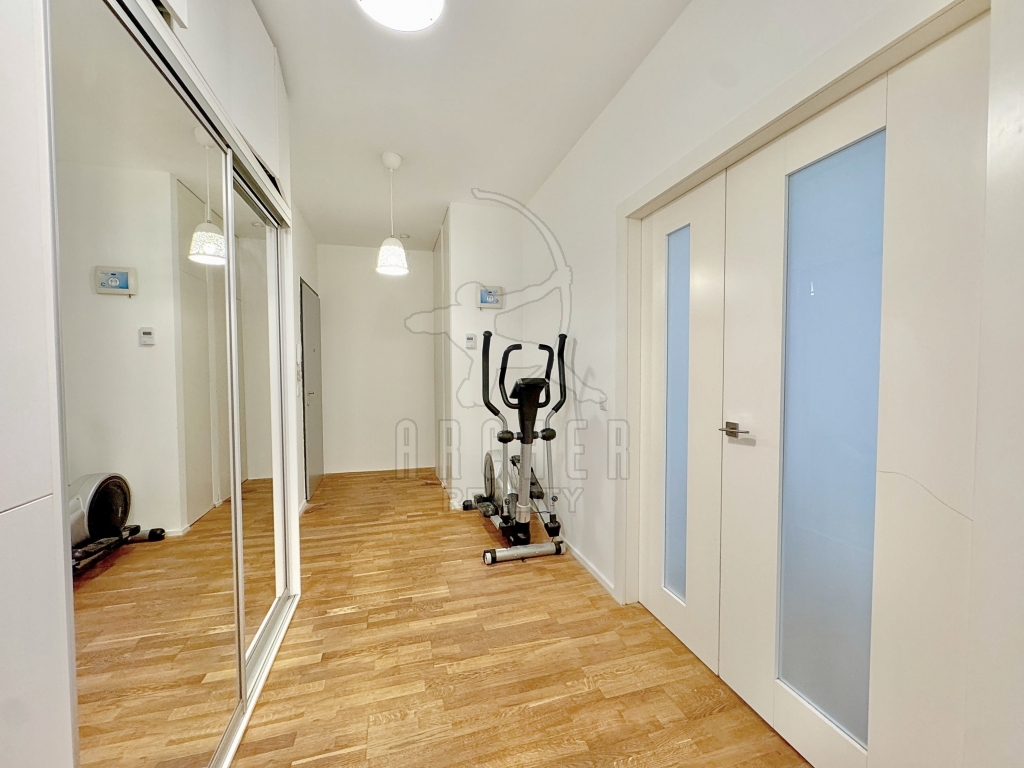 U ložnice je samostatná šatna s posuvnými dveřmi a je vybavena úložným nábytkem po obou stranách. Všechen nábytek je v bílé barvě, což podtrhuje světlost bytu. Byt je vhodný k dozařízení moderním nábytkem, je připravený k okamžitému nastěhování. Mezi fotografiemi bytu jsou i vizualizace, jak je možno byt zařídit.