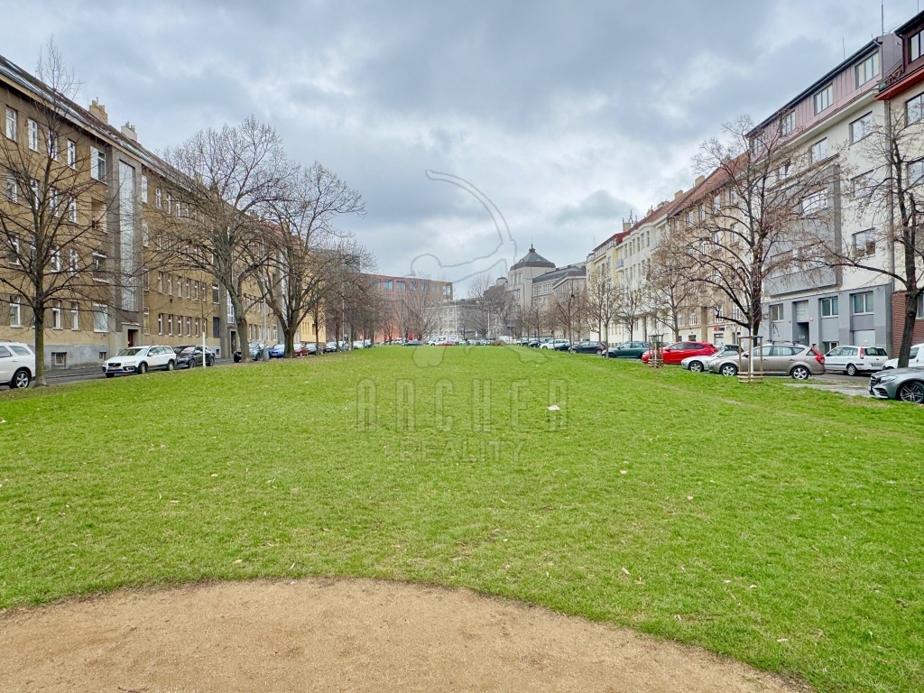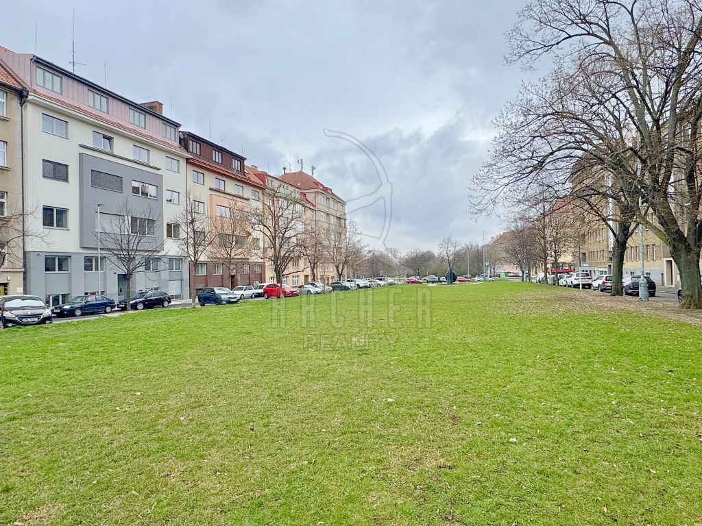Okna vedou do ulice obklopující Engelův zelený pás, vedoucí zástavbou, který propojuje zelení části Prahy 6 se Stromovkou. Byt je umístěný ve zvýšeném suterénu a je přístupný jak po schodech, tak i výtahem. K bytu patří sklepní kóje 3m2.