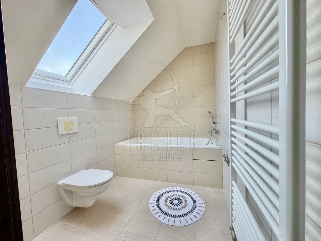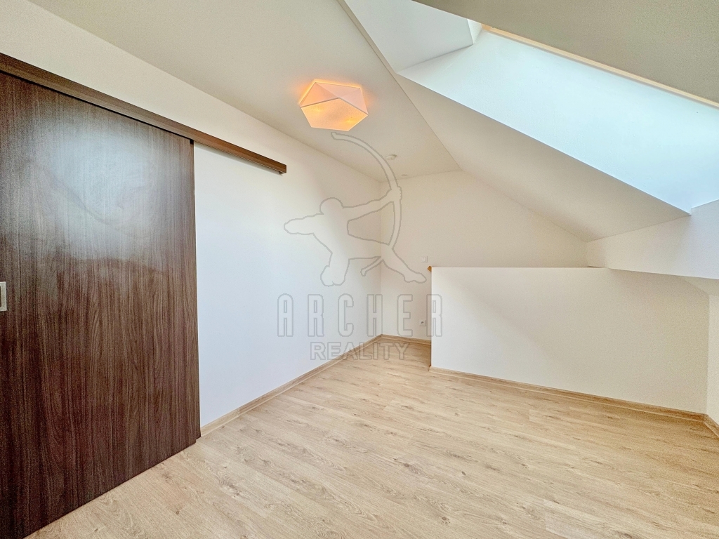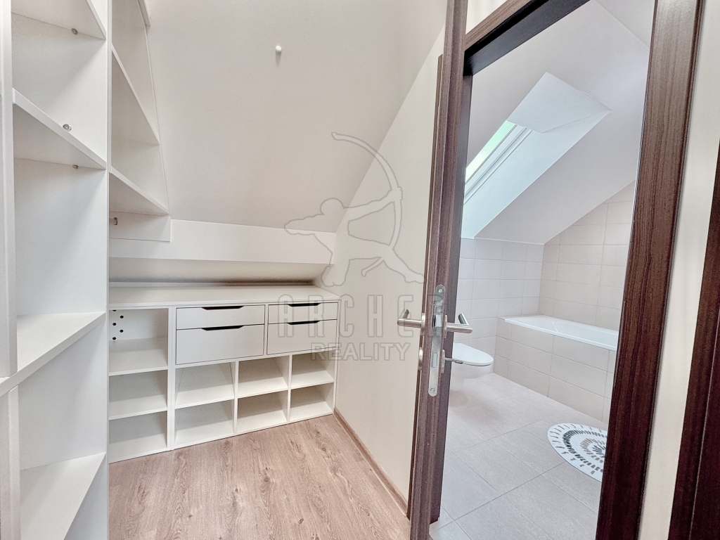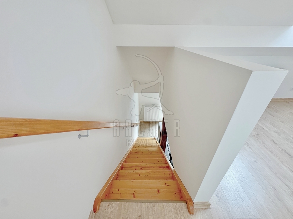 Z obývacího pokoje vedou masivní dřevěné schody do horního poschodí. Schody ústí v horní ložnici, za kterou je umístěna šatna s úložným systémem a druhá koupelna s vanou a druhou toaletou.