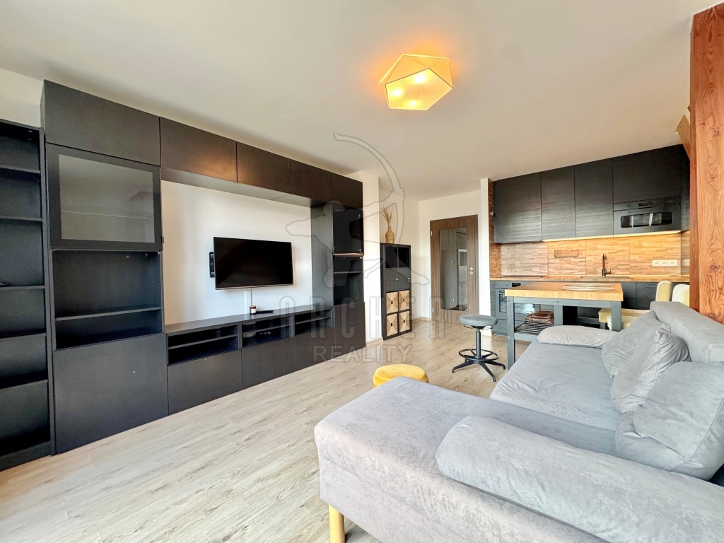 Střed bytu je v prostorném obývacím pokoji prosvětleném francouzským oknem, přes které vstoupíte na terasu 9,6m2 s širokým výhledem. Obývací pokoj je vybaven kuchyňskou linkou s vestavěnými spotřebiči. Linka je v moderní tmavé až černé barvě, stejně jako obývací stěna. Je zde jídelní stůl a pohodlná sedací souprava.