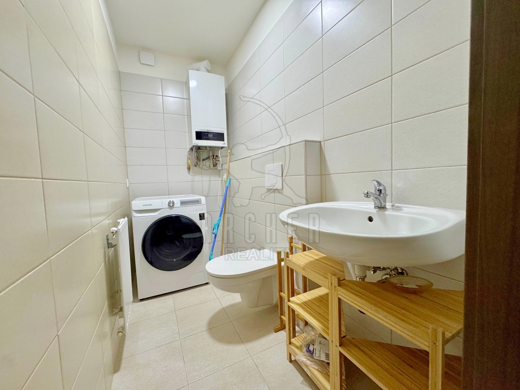 Prosklené dveře přenáší světlo z terasy i do chodby, kde je vstup do bytu a přístup do ložnice a do dolní koupelny. Koupelna je vybavena umyvadlem, toaletou a pračkou. Je zde také umístěn plynový kondenzační kotel, který vytápí celý byt přes radiátory a ohřívá vodu.