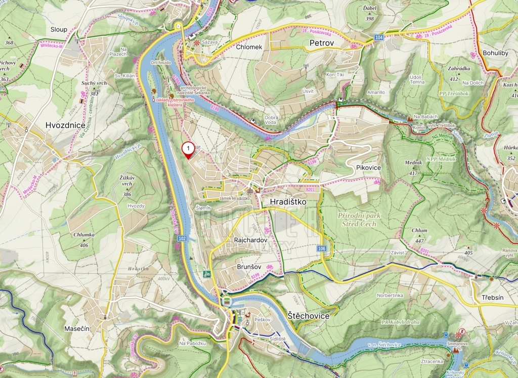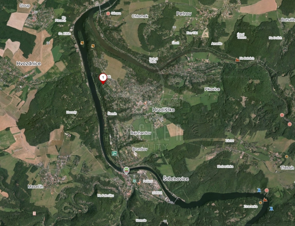 Stavební pozemek k výstavbě rodinného domu či chaty blízko Prahy v klidné části obce Hradištko. Obec je 15 km od hranice Prahy a je atraktivním místem pro bydlení či rekreaci. Pozemek je rovný o rozměrech cca 19 x 46 m (882 m2). Je přístupný zpevněnou obecní komunikací, na pozemku je původní chata a kůlna. Pozemek je v oblasti rodinných domů a chat. Na zadní stranu pozemku navazuje les.