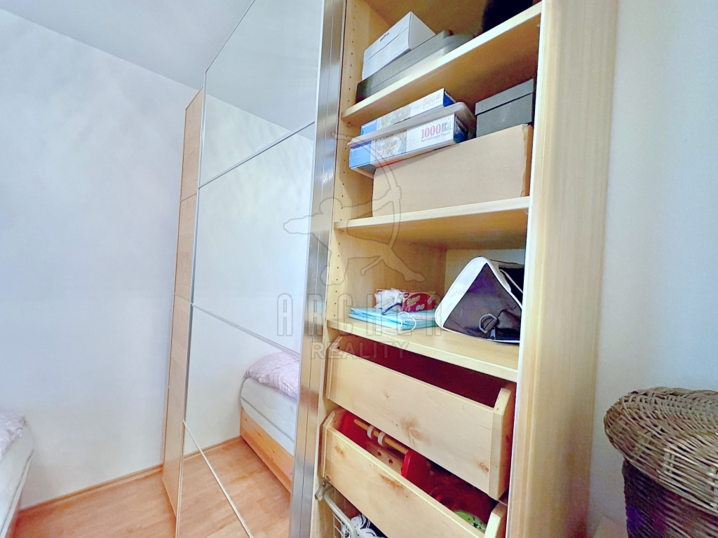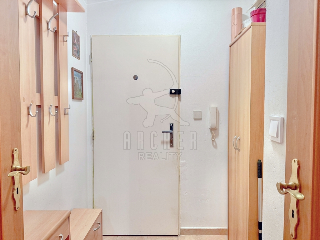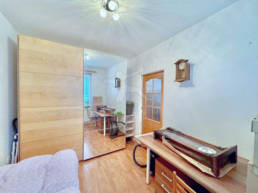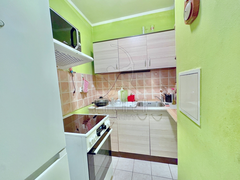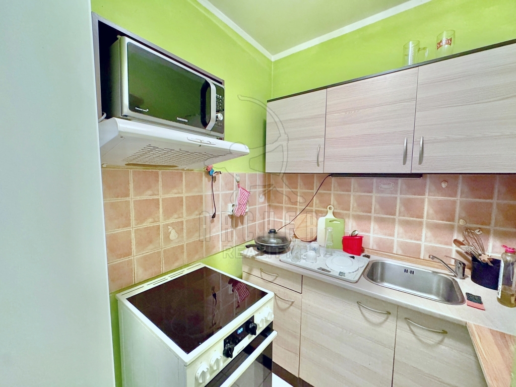 Obývací pokoj je prosvětlený ze dvou stran a je průchozí do ložnice a malé kuchyně, vybavené sporákem se sklokeramickou deskou, lednicí s větším mrazákem, mikrovlnkou a kuchyňskou linkou. V ložnici je velká skříň s posuvnými zrcadlovými dveřmi.