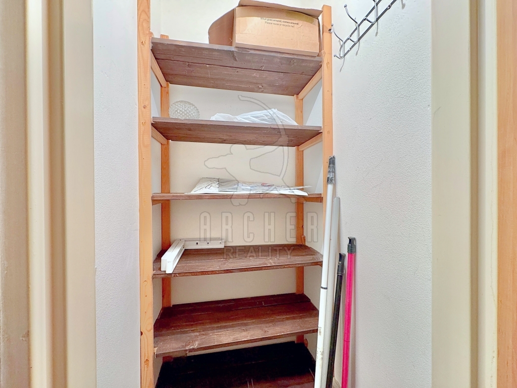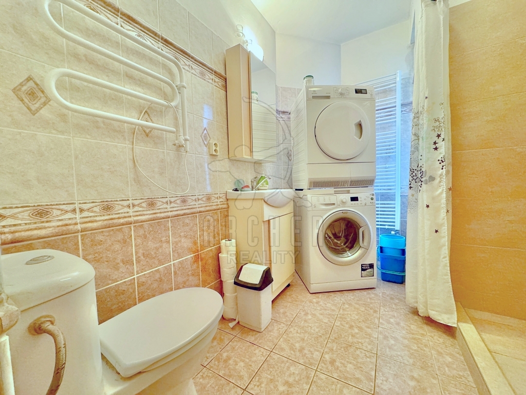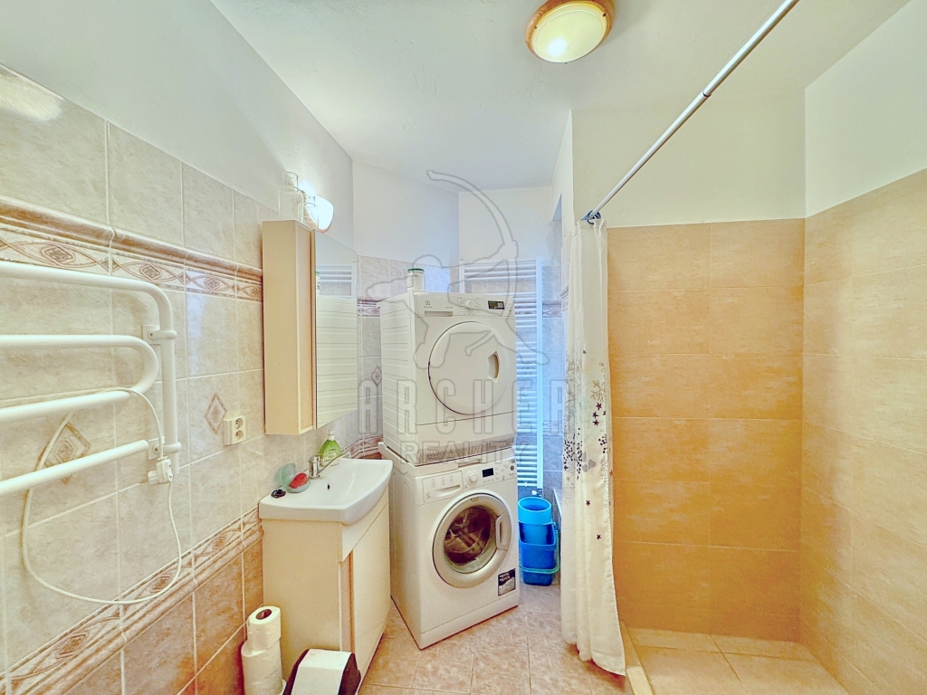 Koupelna je prostorná a je vybavena velkým sprchovým koutem, umyvadlem, toaletou, pračkou a sušičkou. K bytu náleží komora.
