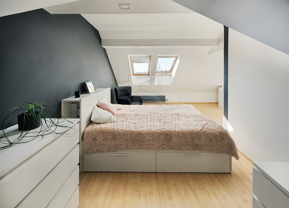 Celková podlahová plocha podkrovního bytu činí 105 m2 (užitná plocha 80 m2)