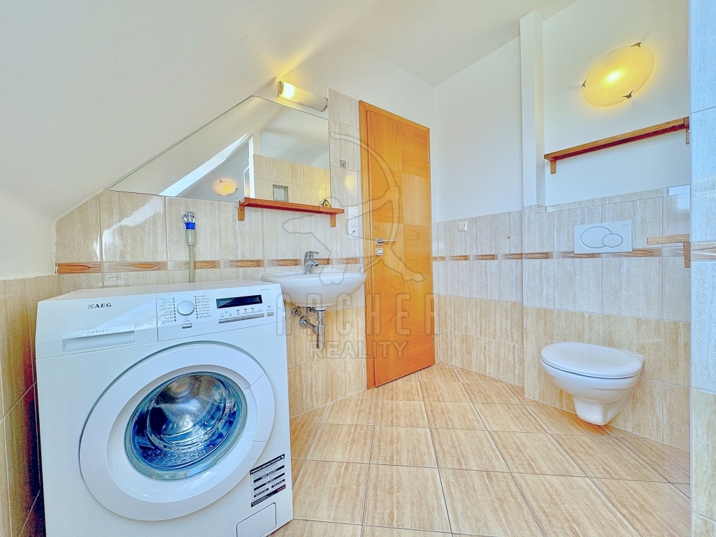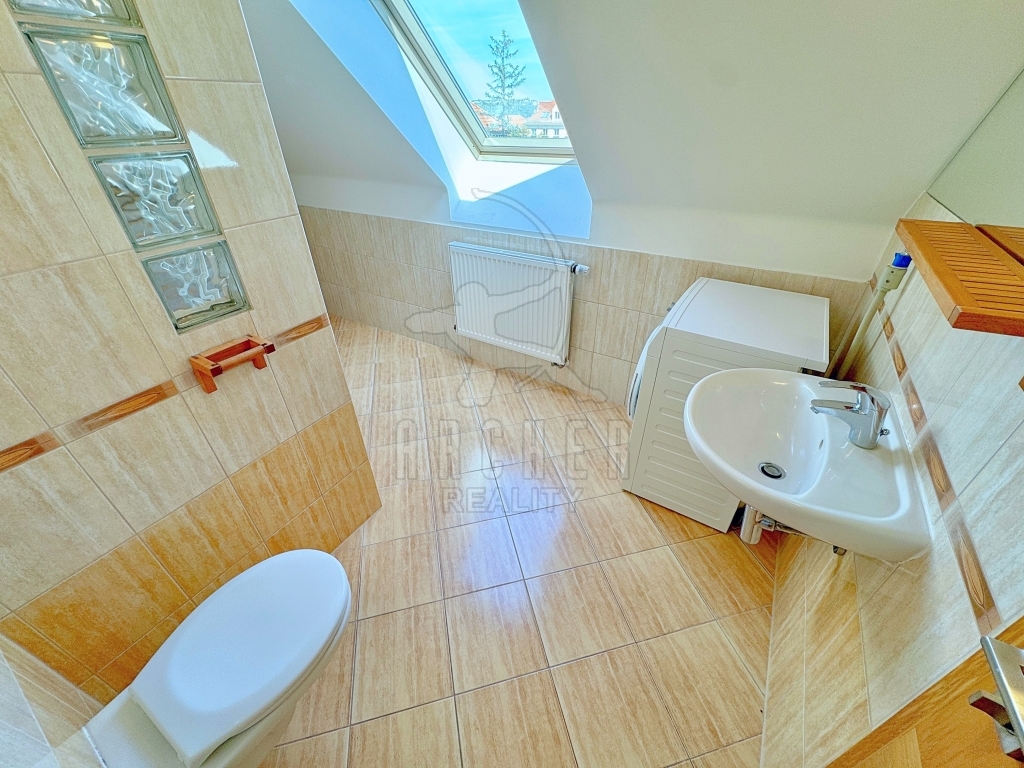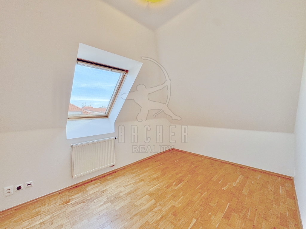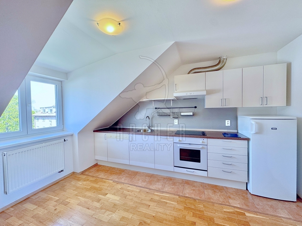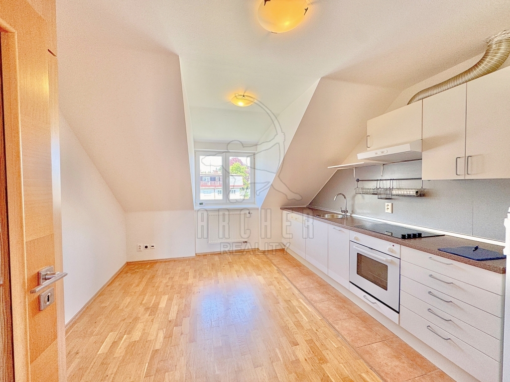 Na obývací pokoj navazuje kuchyň s linkou s vestavěnými spotřebiči po pravé straně a dostatkem místa na jídelní stůl či další nábytek. Výhled je zde přes park v otevřeném dvoře směrem na okraj Hanspaulky. Na obývací pokoj navazuje i ložnice s velkým střešním oknem a za ní prostorná koupelna ve svěžím designu, vybavená rohovou vanou, umyvadlem, toaletou a pračkou.