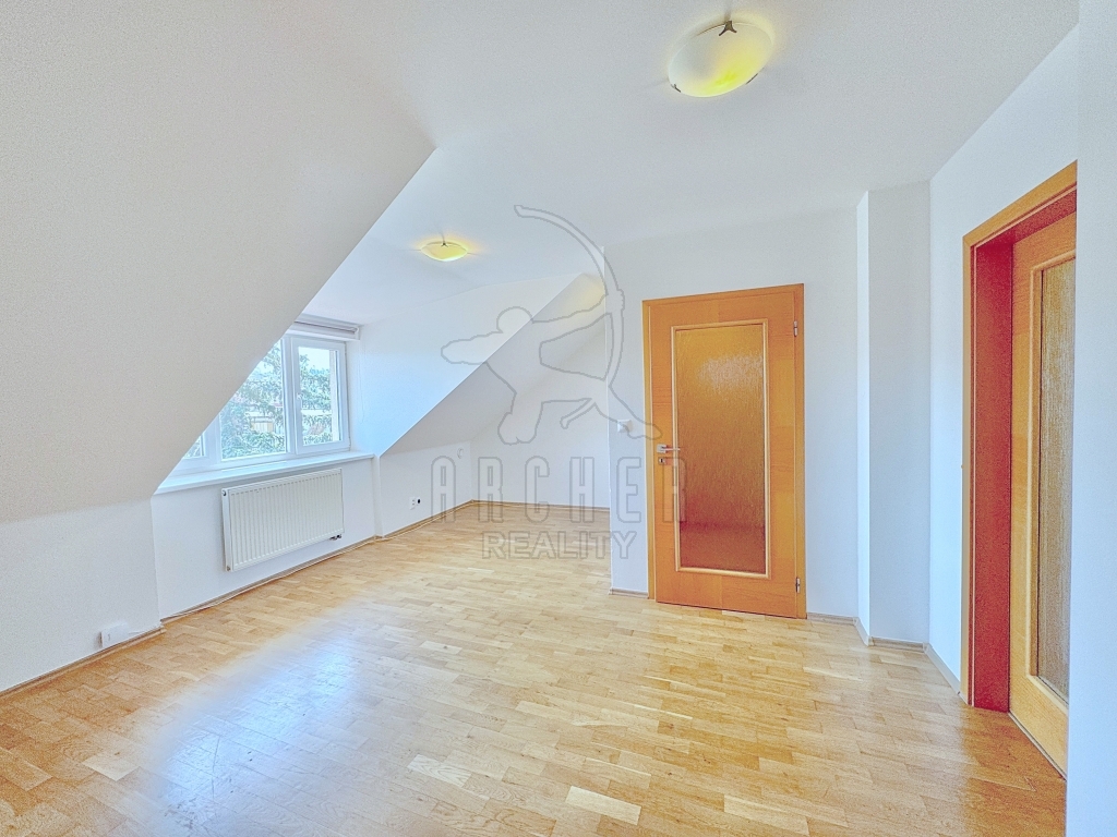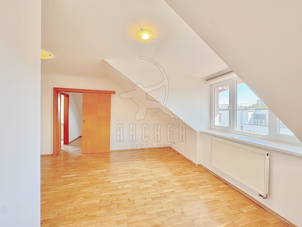 Obývací pokoj má příjemnou atmosféru podkrovní atypičnosti. Je vybaven třídílným oknem s výhledem ve směru na Ořechovku a Střešovice.